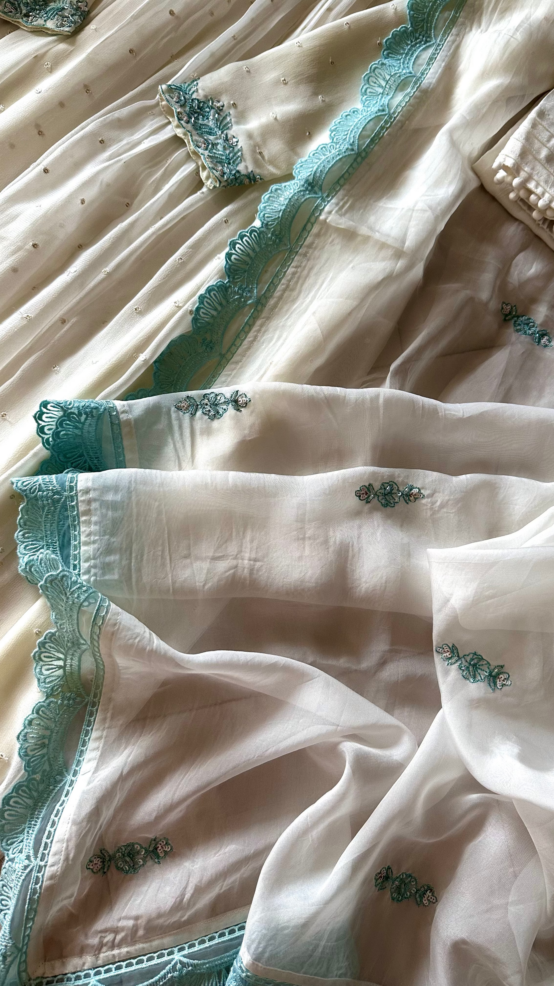 Just like the calmness of vanilla, this outfit carries a soft, soothing feel the moment you wear it. Done in a pure off-white georgette with tiny sequins and thread work all over. The powder-blue handwork on the neckline and sleeves adds a gentle freshness without taking away the simplicity. Paired with an organza dupatta finished with handwork motifs and powder-blue lace detailing.
