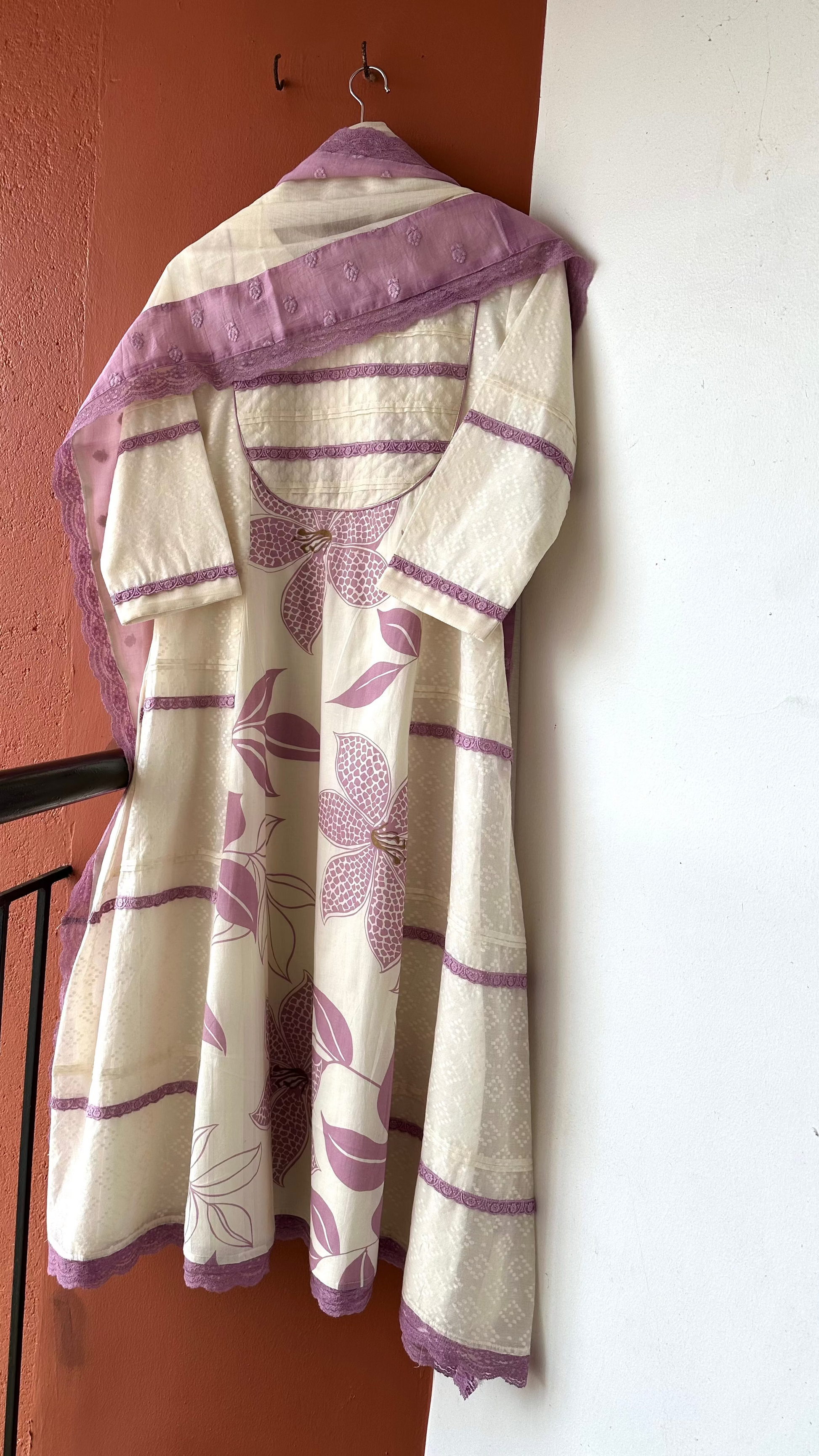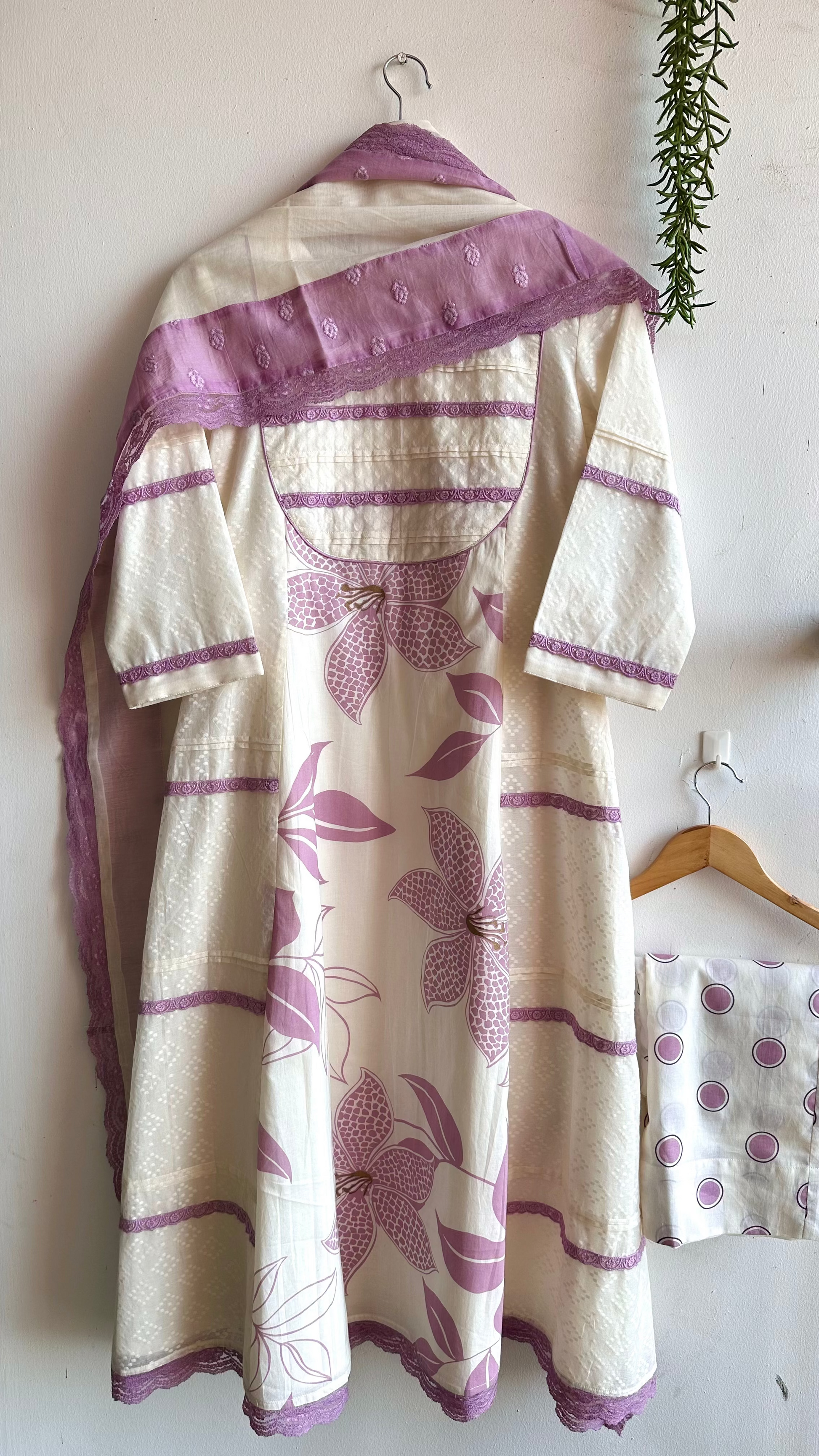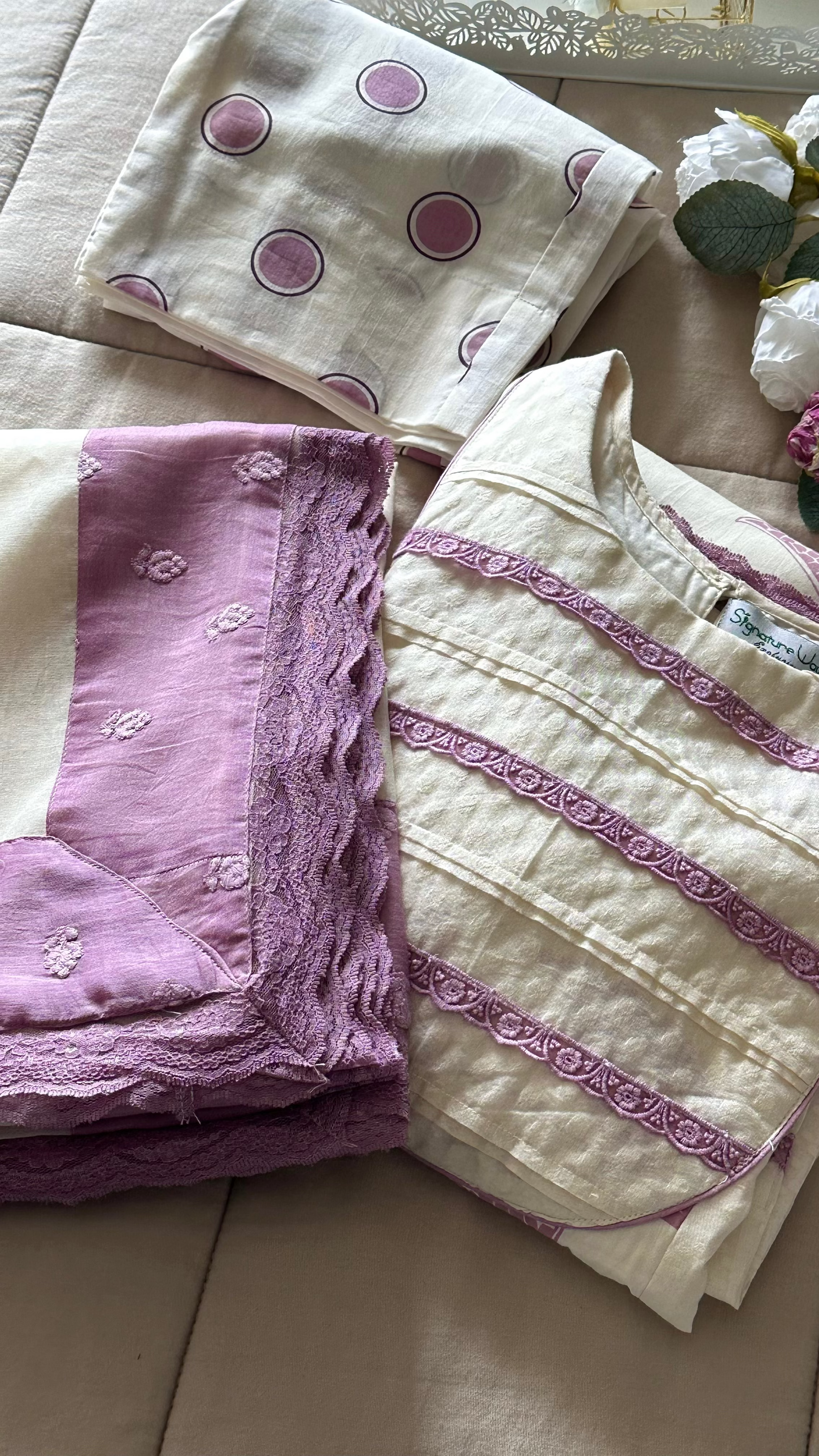 It’s a Chanderi self-designed and printed blend with a graceful play of laces. And did you notice the pants? They come in a cute polka design, giving that same “melting” vibe I felt when I first touched this fabric. The set is completed with a beautiful Chanderi dupatta featuring thread borders and lace edging, adding that perfect finishing touch.