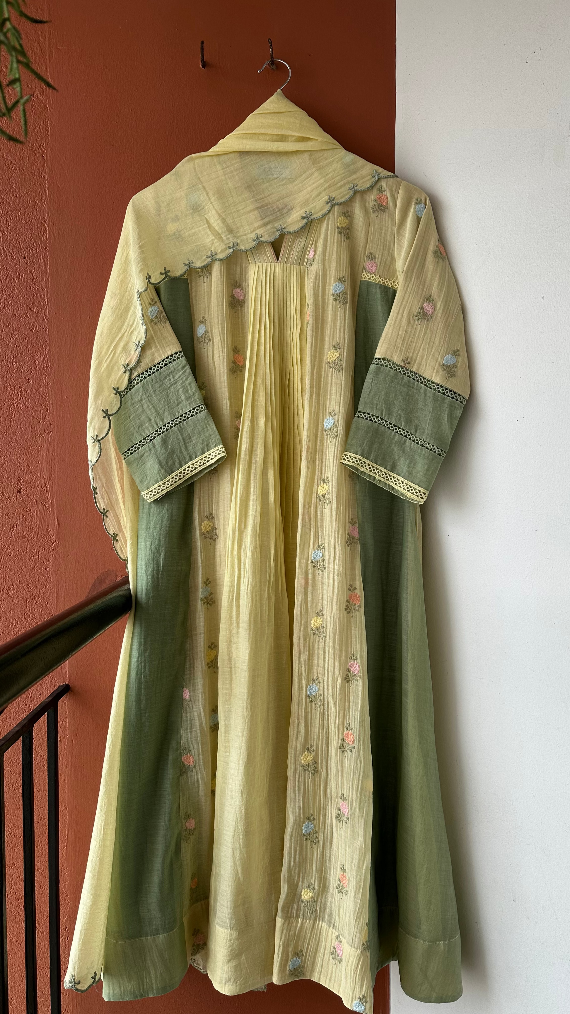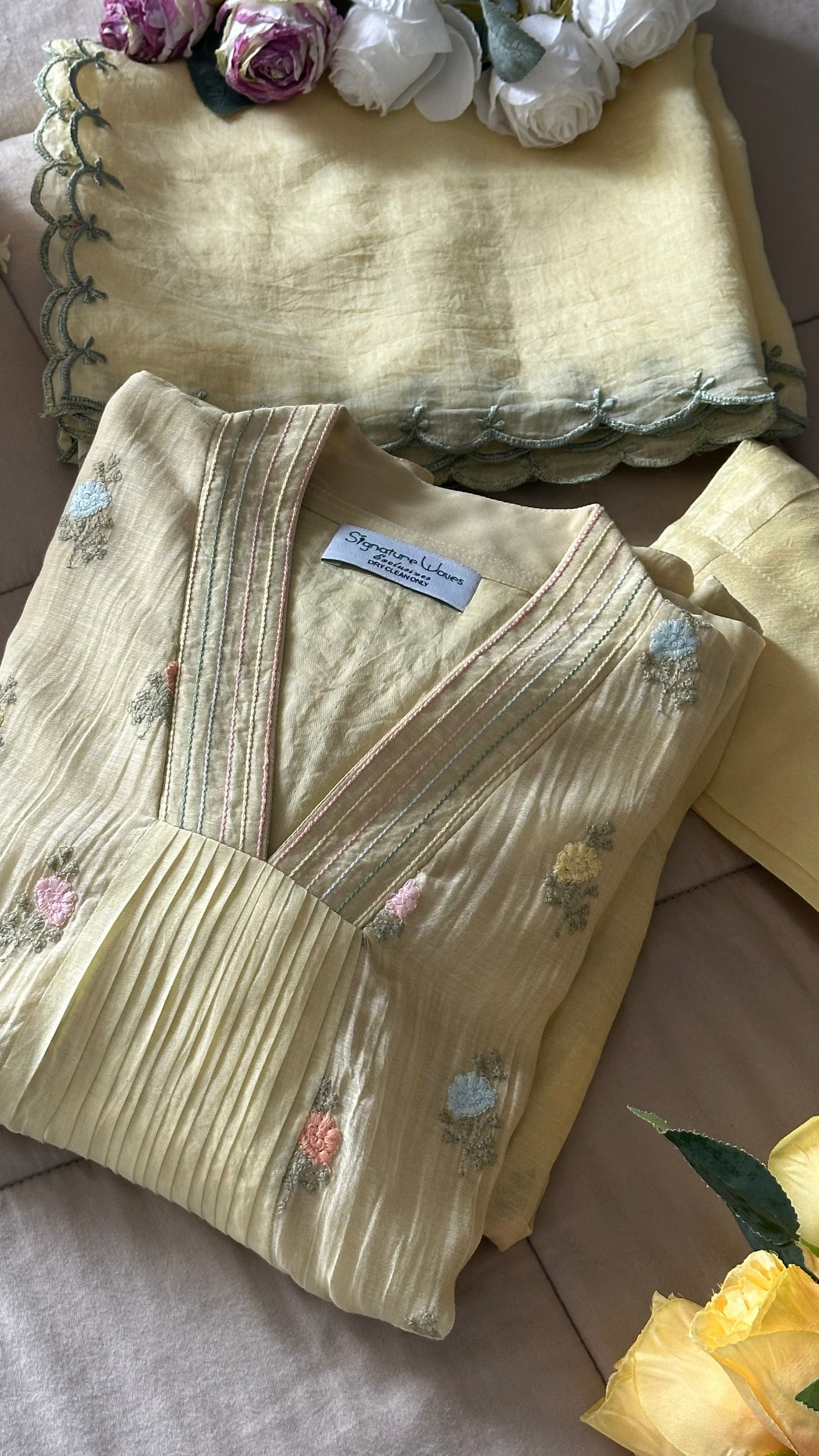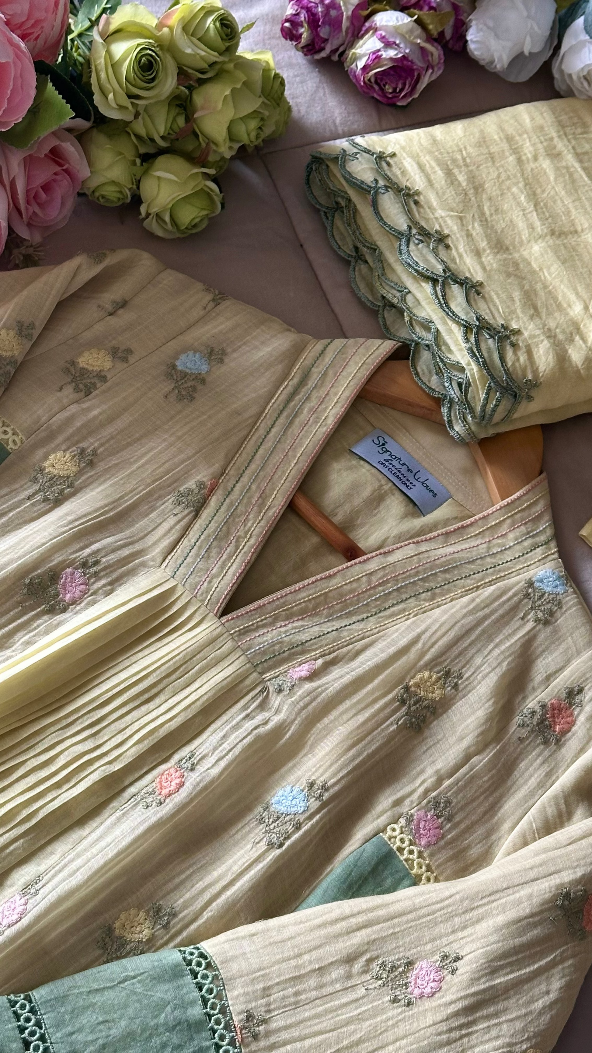 A soft pastel melody of buttery yellow and sage green, brought alive with tiny floral threads that bloom all over,while multicoloured running stitches on the overlapping neck add a cheerful touch of artistry.The gentle pleats on the yoke, lace-detailed sleeves, and the scalloped with floral embroidery dupatta together create a fresh, soothing vibe that feels like a quiet morning — calm, breezy, and full of warmth.