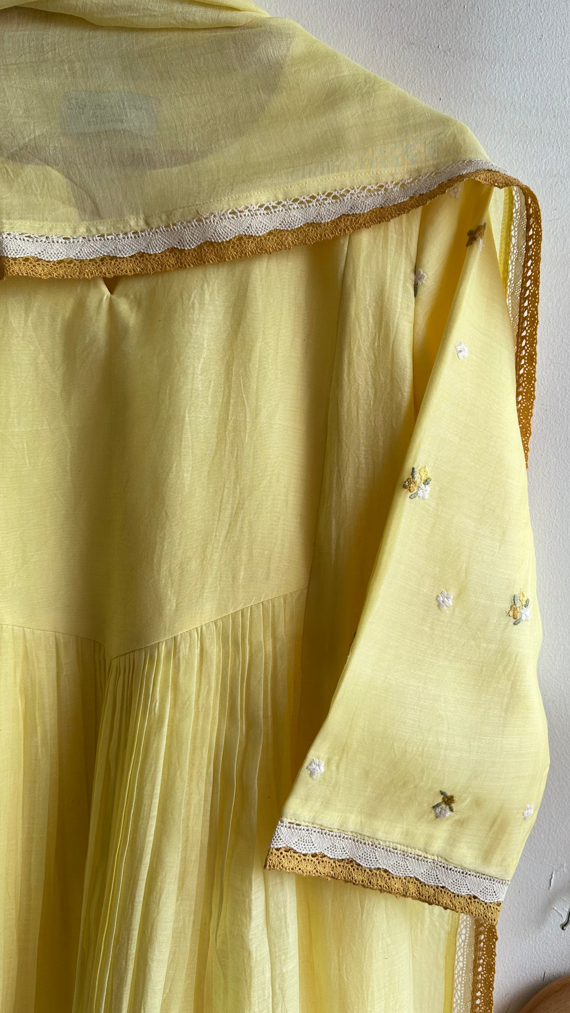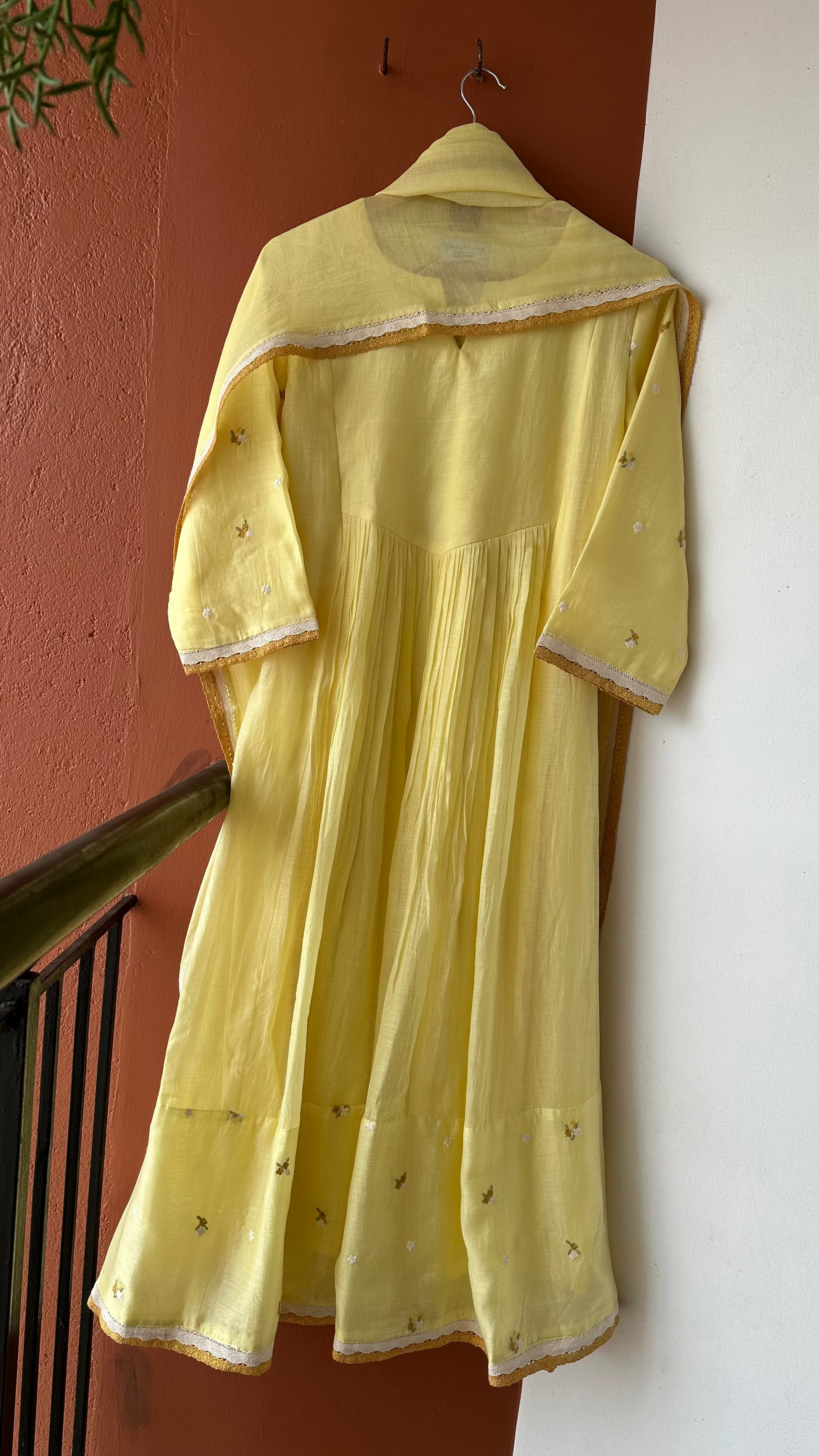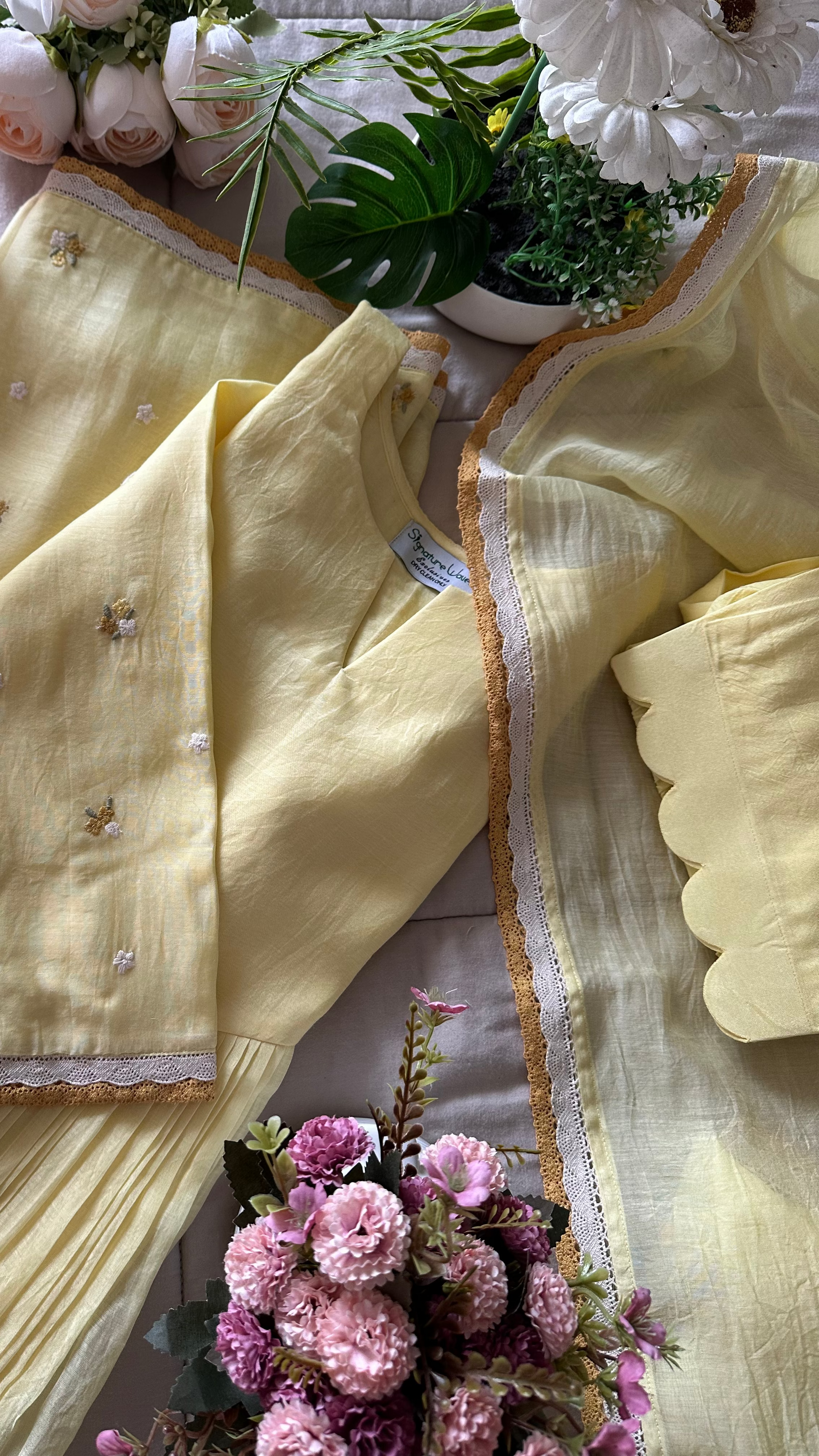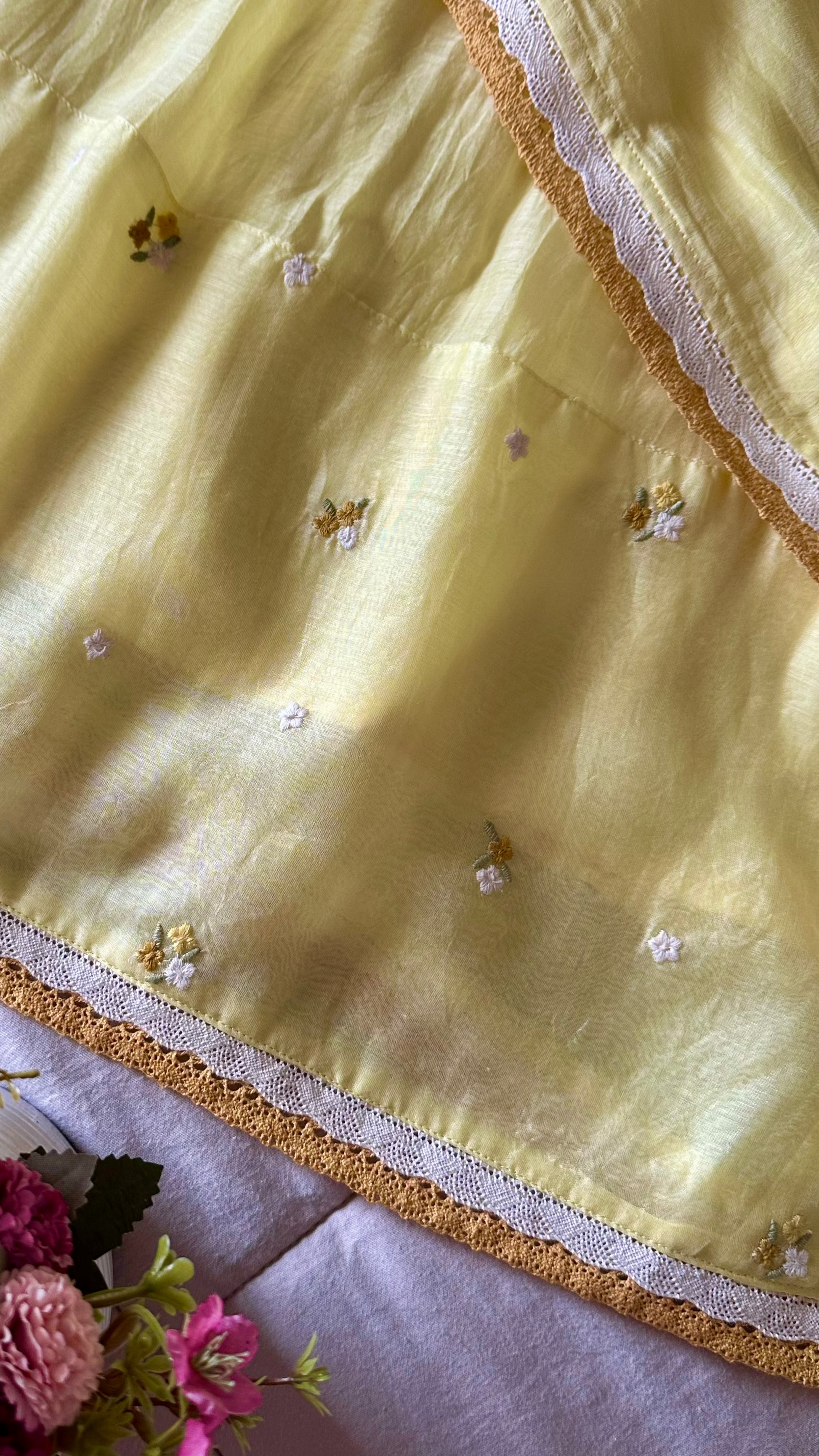 The kurta and the dupatta are done in Chanderi and the pants in fine santoon. The sleeves and the hemline have been embellished with silk embroideries and the sleeves , hem and dupatta has been embellished with fine crochet laces.