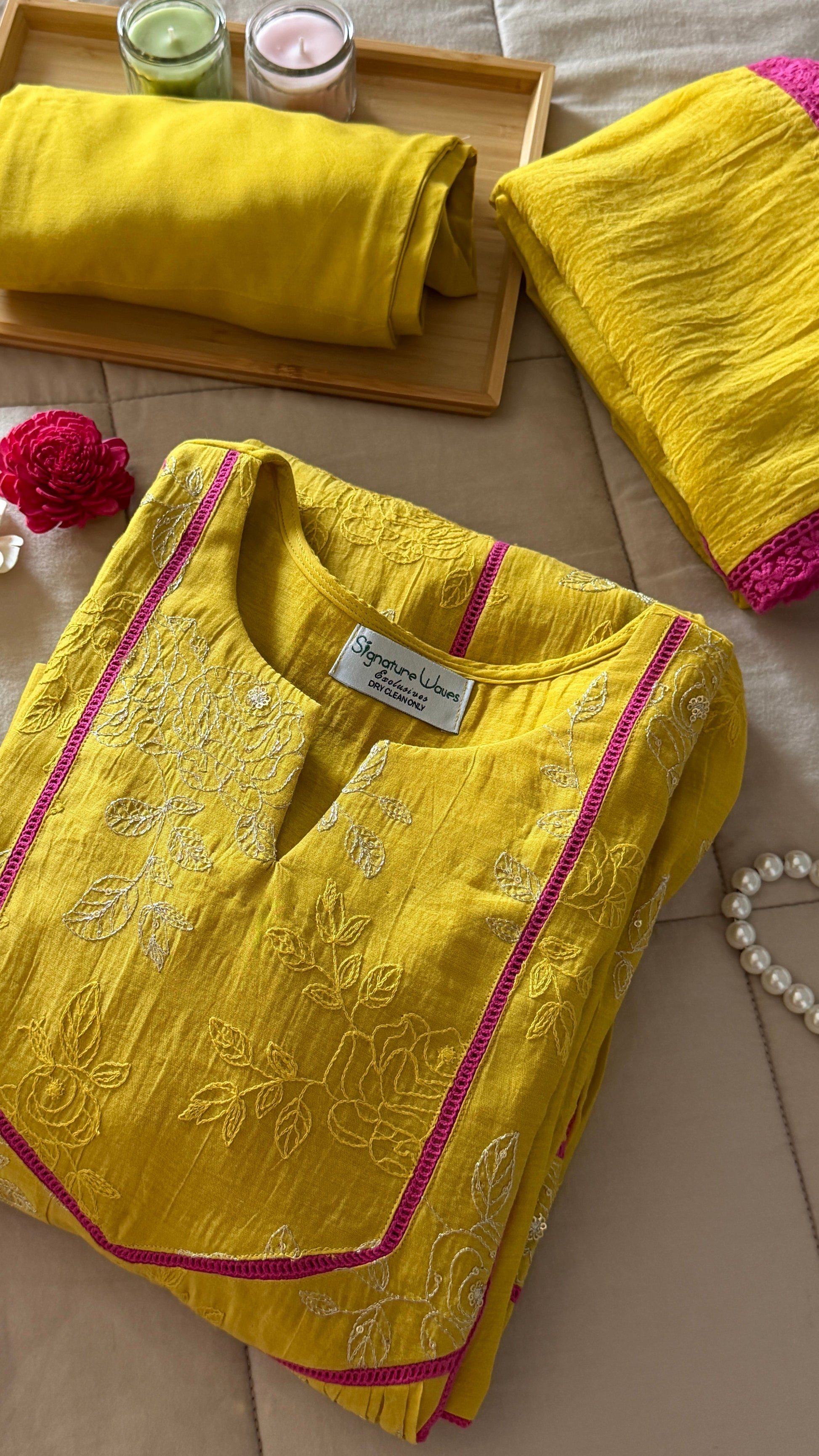 A fresh burst of yellow in pure Chanderi, finished with striking hot pink lace.A frame ready beauty.