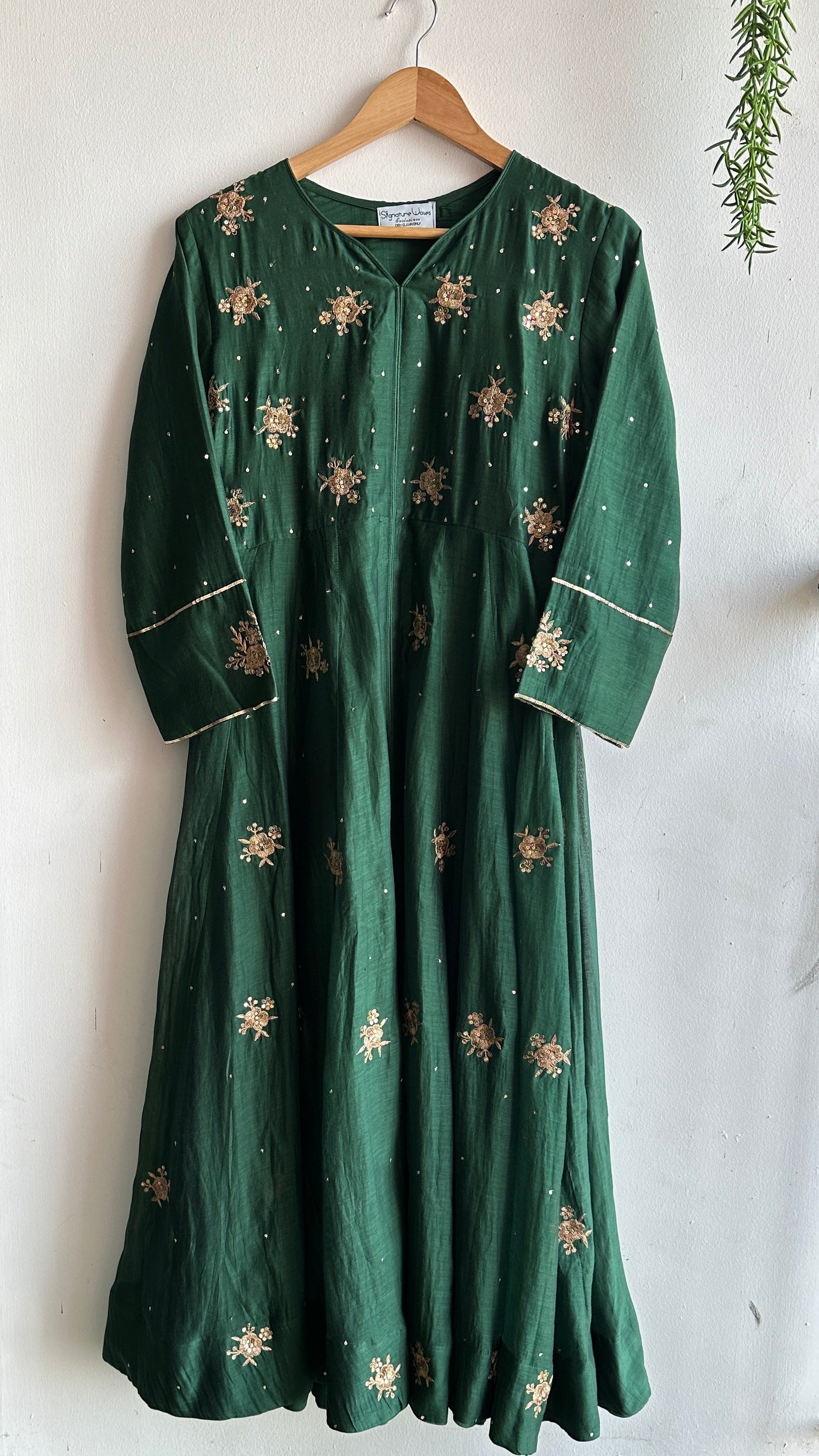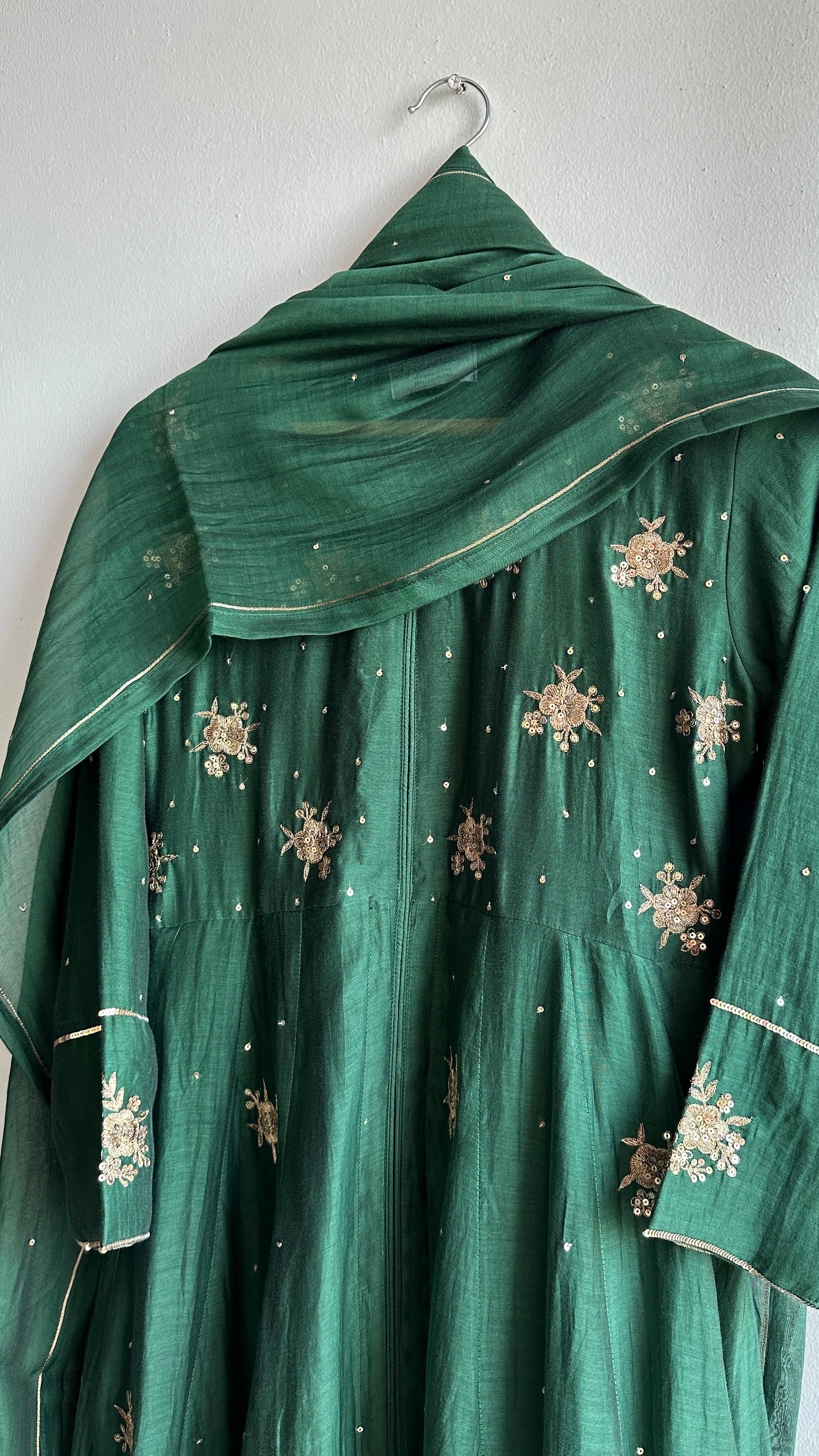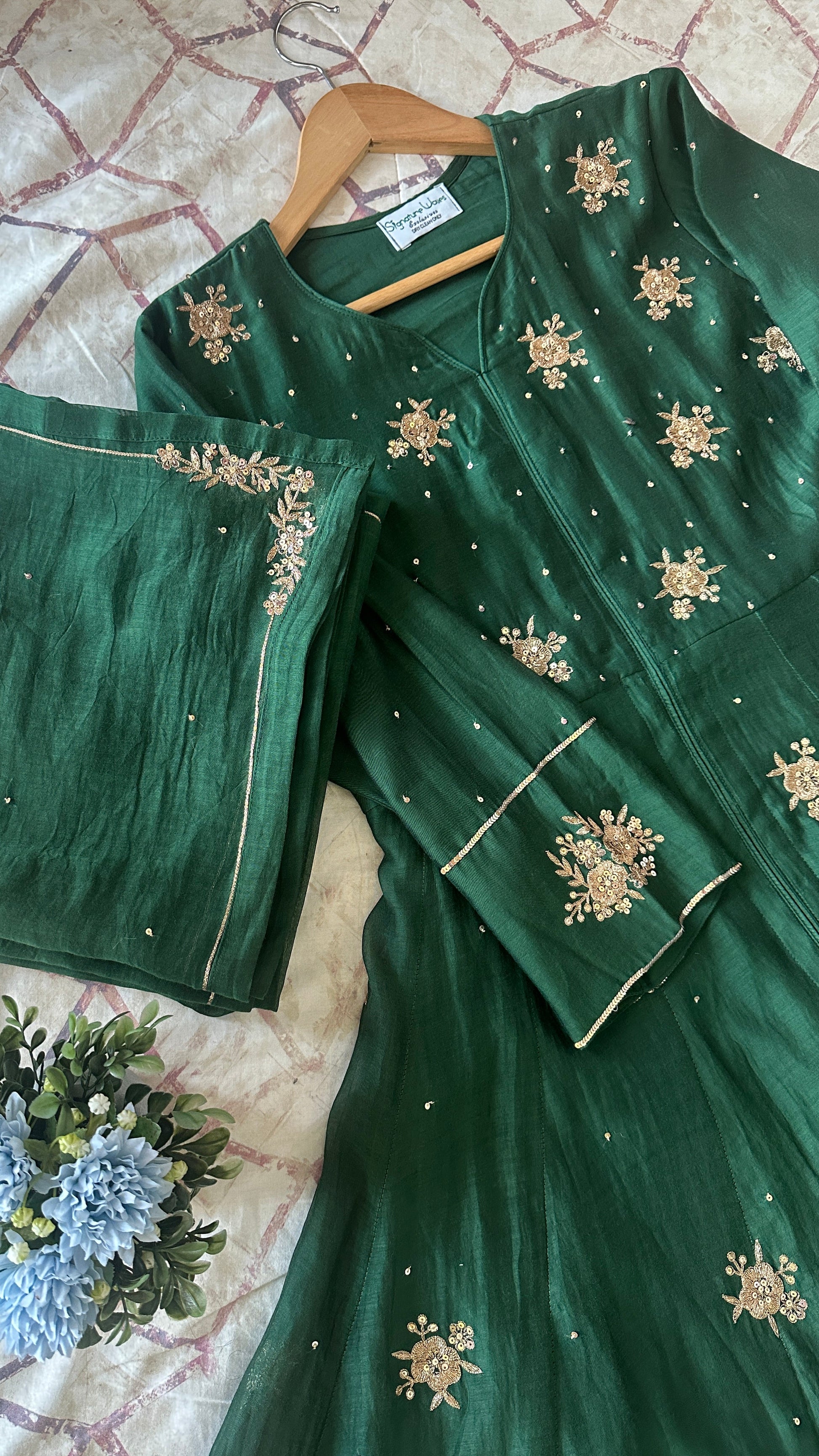 Presenting passion of love. The unstoppable affair of Bottle green in Chanderi fabric with gorgeous hand work detailing. This beauty has that very modern feel to it.