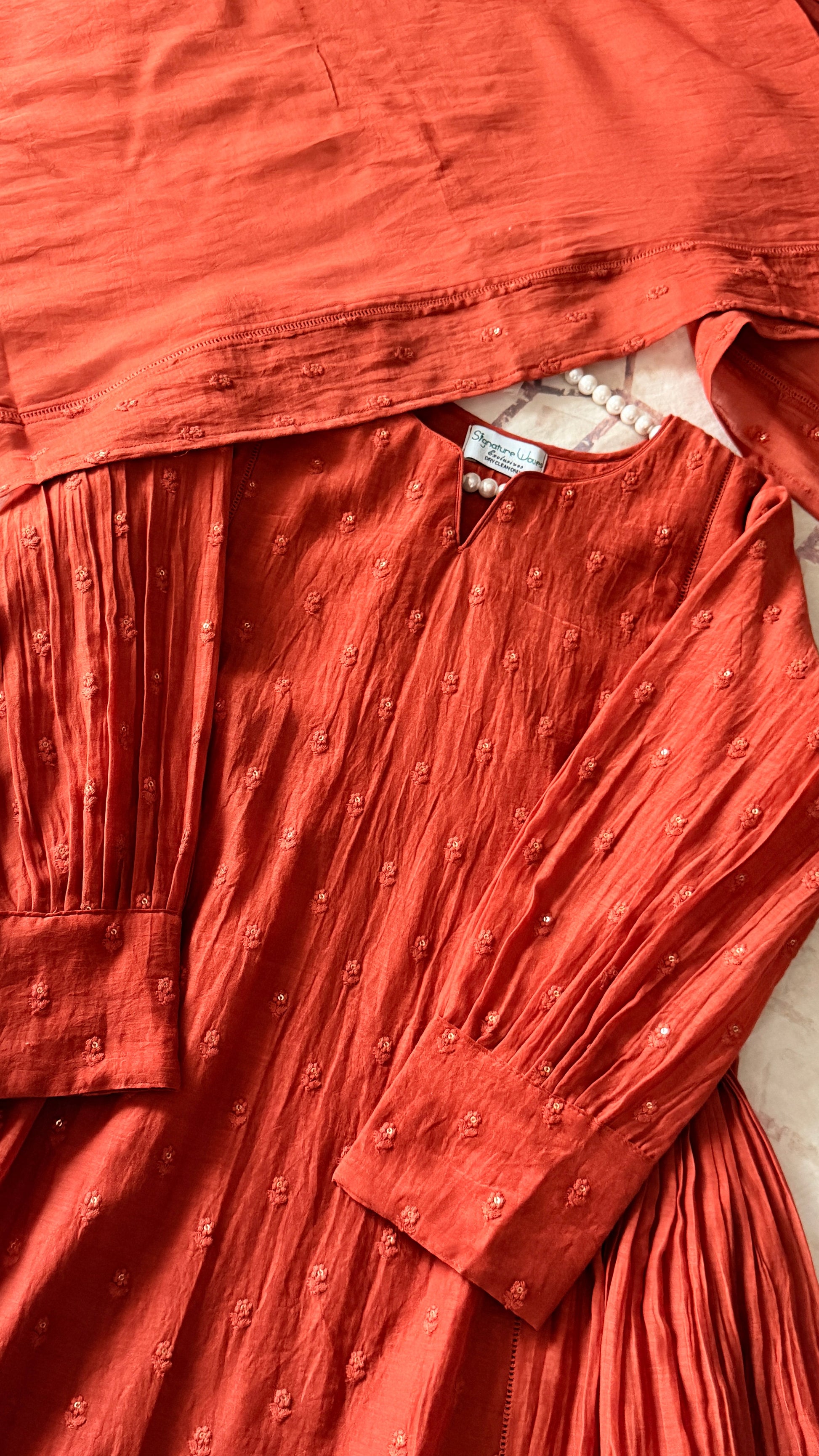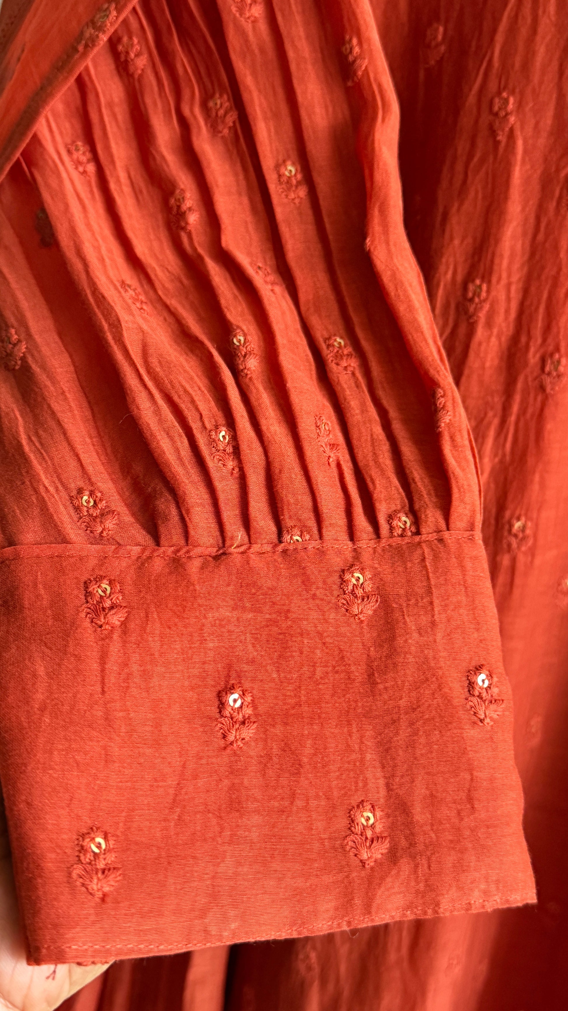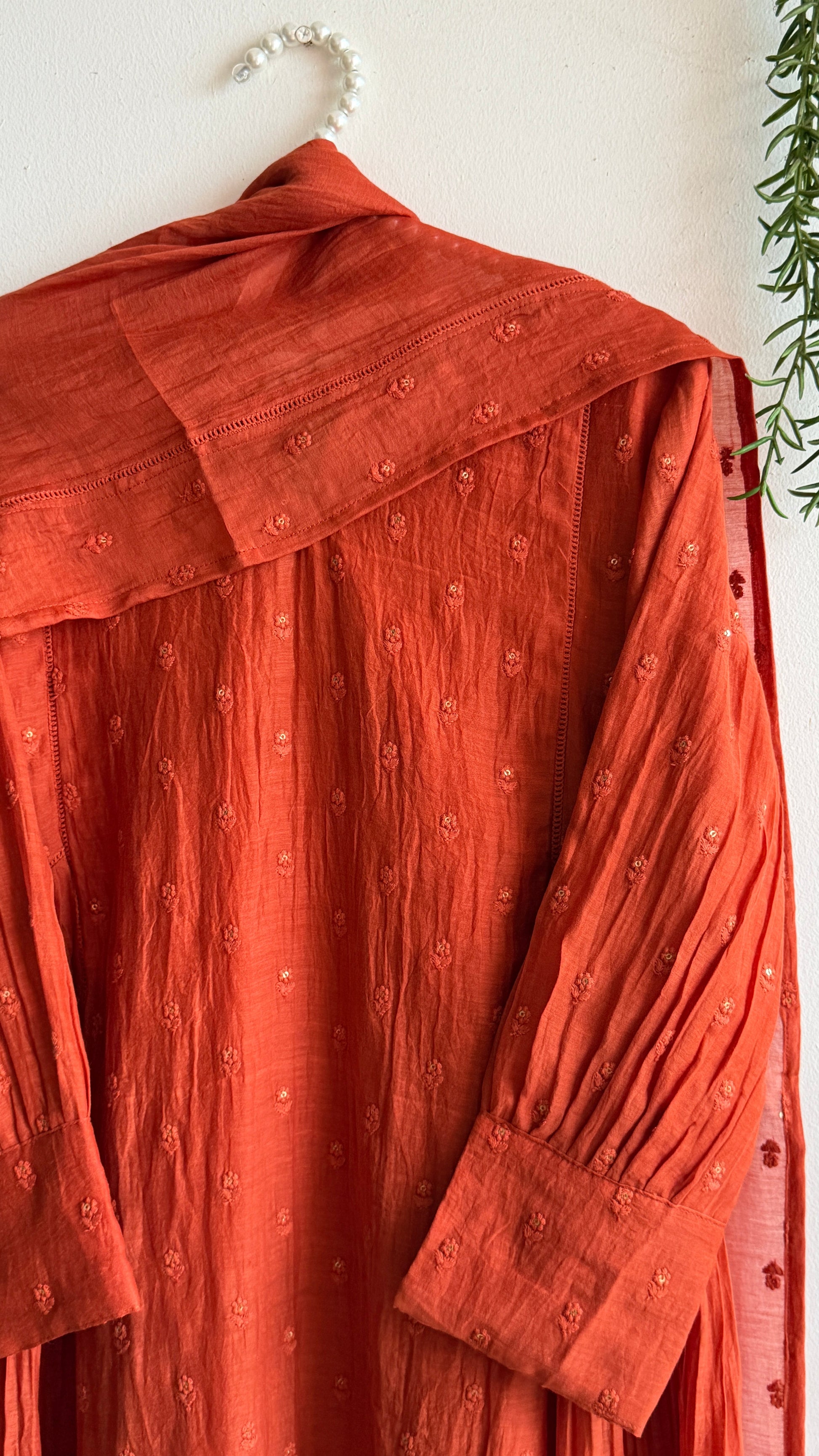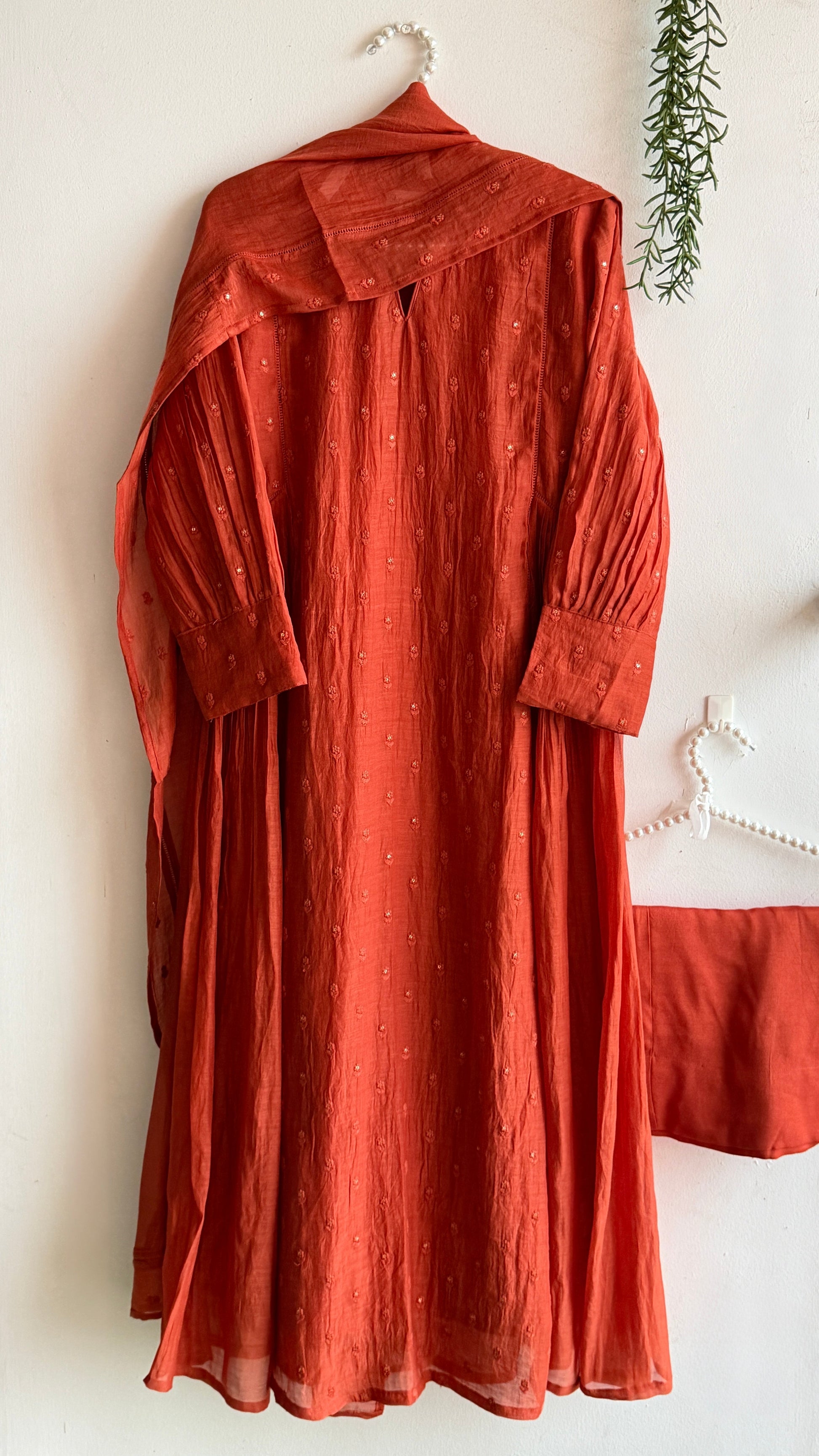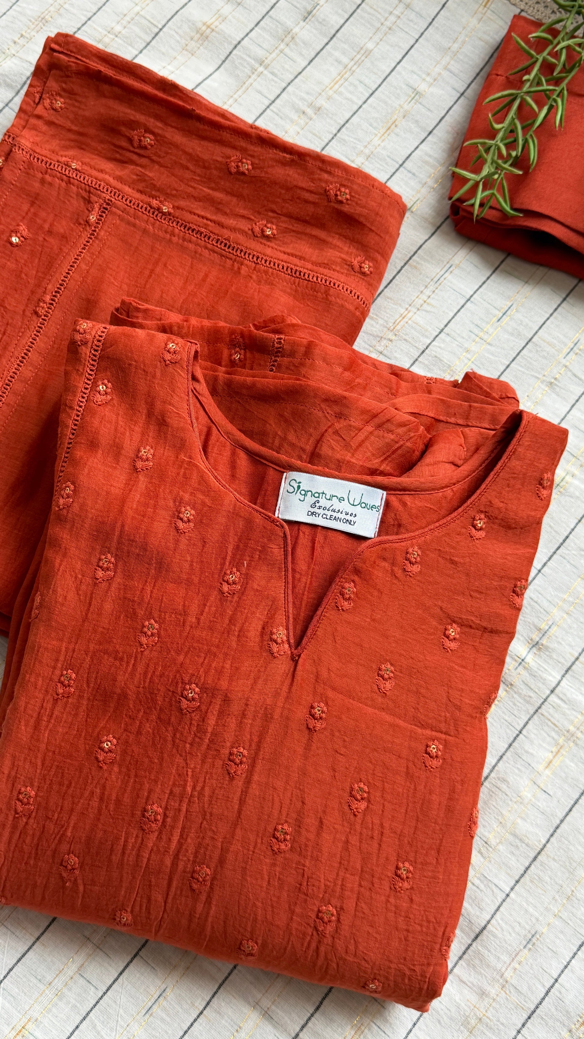 A refined pick in deep burnt orange.Zuri Rust is a three piece Chanderi suit set features delicate sequin and thread buttas scattered across the fabric like a starry sky. The kurta is paired with straight cut cotton pants for ease and structure. Completing the look is a matching Chanderi dupatta with subtle detailing that adds just the right amount of shimmer.
